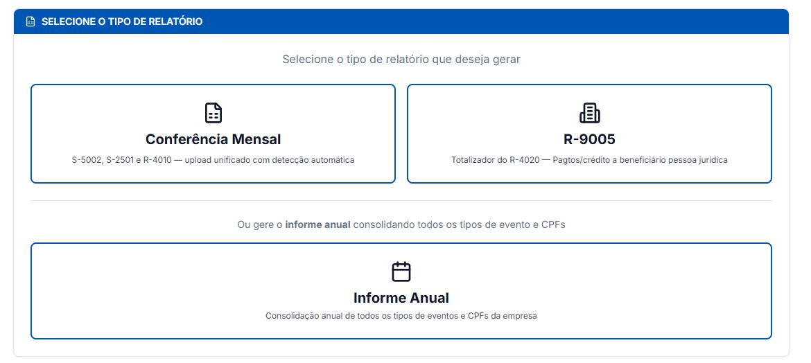 Carregue os XMLs dos eventos do eSocial (S-5002), Reclamatória Trabalhista (S-2501) e da EFD-Reinf (R-4010 e Totalizador R-9005 do R-4020) e emita relatórios de forma automatizada.